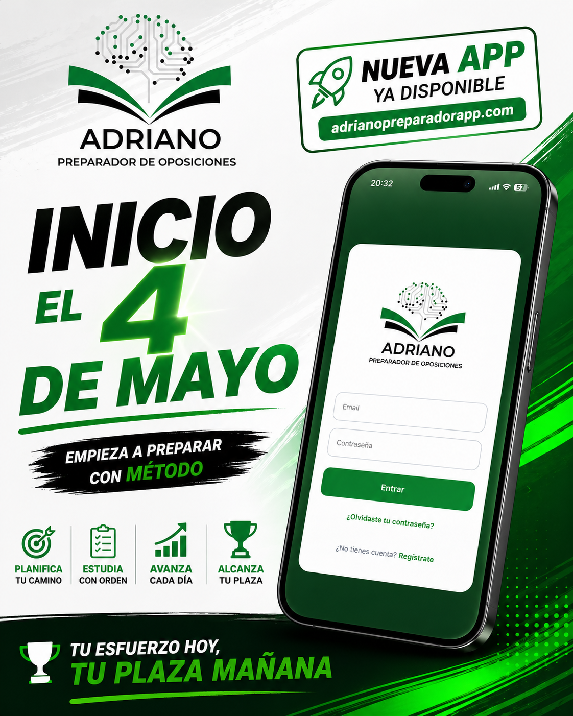 Para la promoción interna de este año que se examina el 30 de Mayo , además, ya tenemos disponible la NUEVA APP WWW.ADRIANOPREPARADOR.APP. COM de test, una herramienta muy útil para reforzar el estudio, practicar preguntas, repasar bloques y llevar mucho mejor el control del avance. Es una forma cómoda de aprovechar cualquier rato libre y convertir el repaso en algo mucho más constante. Hay ya mas de 10.000 preguntas, y estamos incorporando las explicaciones a las preguntas, test por subtemas, test prácticos, y otras novedades.